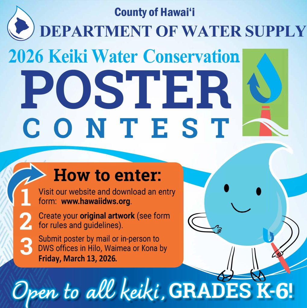 Hawai‘i Island kindergarteners through sixth graders may submit original artwork depicting this year’s theme, “Make Every Drop Count,” by the deadline of Friday, March 13, 2026. This contest challenges keiki to illustrate how using water wisely can help conserve our most precious resource —safe drinking water. Entries will be judged based on creativity, inspiration, and originality.